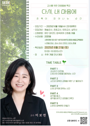 사회정서발달교육협회에서 5/30(금)까지 모집 중인 [교사를 위한 마음돌봄 특강]을 통해서 ‘나’의 마음을 들여다보고 챙겨주는 기회를 만들어보아도 좋을 것 같습니다 :)