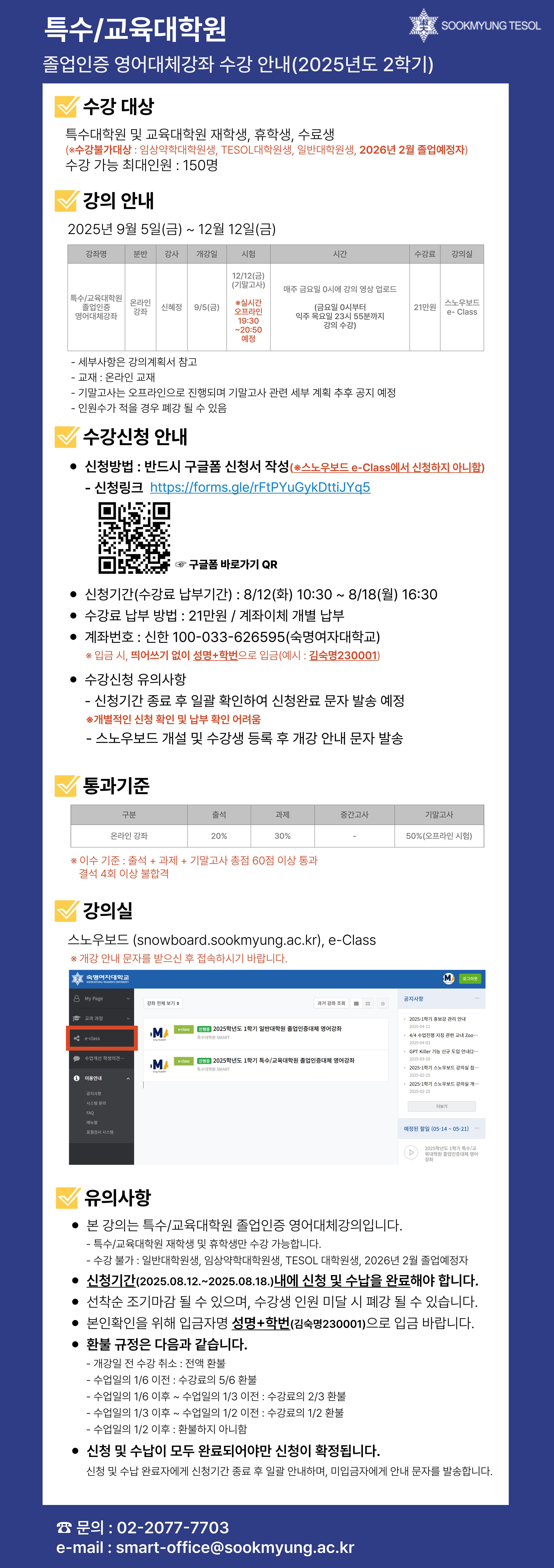 2025학년도 2학기 특수대학원 졸업인증 영어대체 강좌 수강신청 안내입니다.